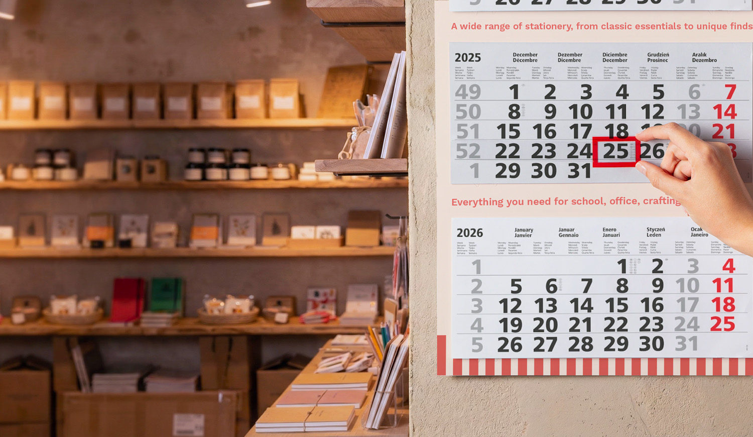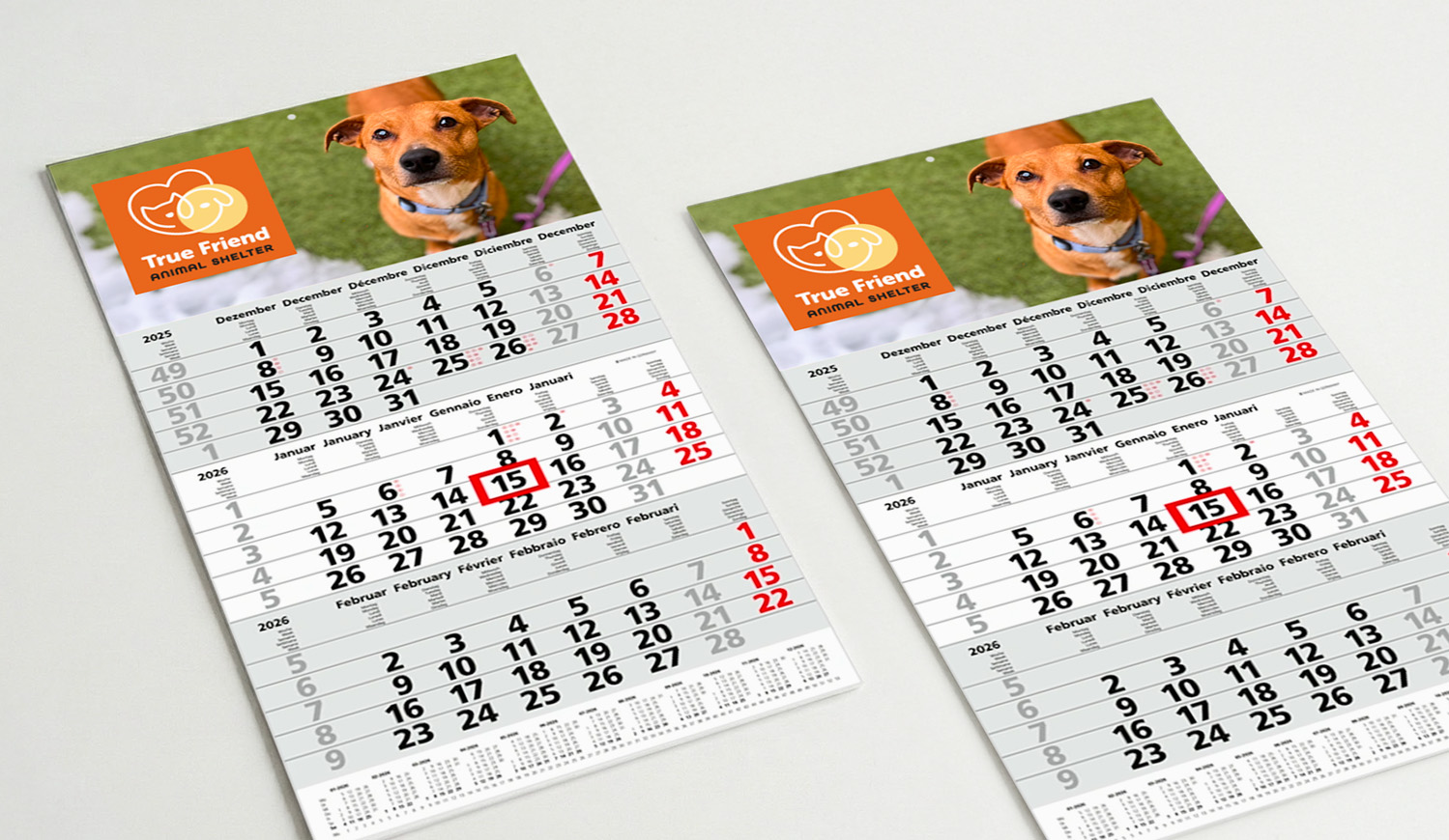 Le calendrier regroupe 3 mois sur une seule page, de manière claire, ordonnée et en blocs séparés. Il est équipé d’un curseur pour indiquer la date du jour, les mois sont présentés en plus de 6 langues différentes et les jours fériés internationaux sont inclus. L’en-tête en carton personnalisable vous permet d’ajouter votre identité visuelle et votre style au calendrier.